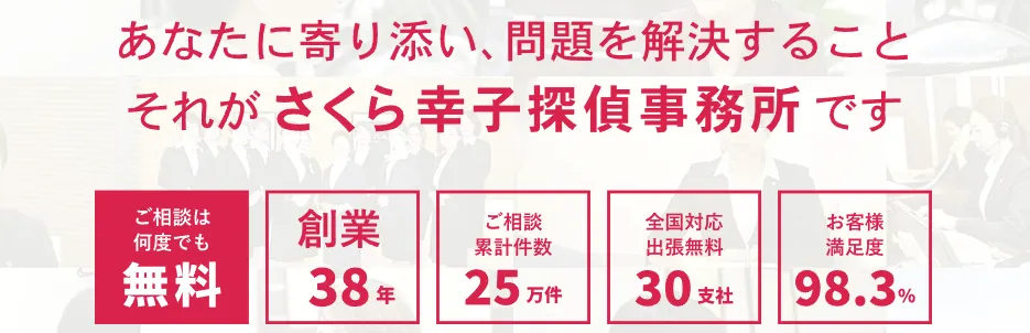 さくら幸子探偵事務所は、創業38年にわたり浮気・不倫調査、素行調査、行方調査など幅広い案件を解決してきた探偵サービスです。