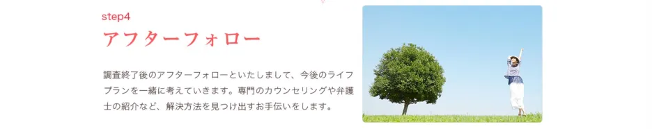 特に調査後のアフターフォローでは、必要に応じて弁護士などの専門家を紹介してくれます。