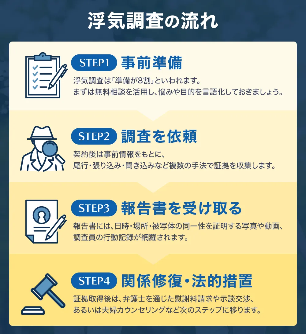 浮気調査の流れとは?はじめての浮気調査 依頼者が知っておくべき全工程
